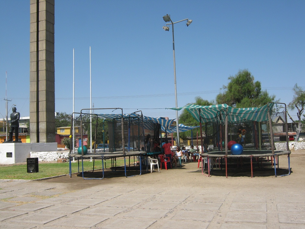 Trampolin 11: Trampoline mit Netz und Bällen drin und Diskothek nebendran, Arica, Chile: Foto von Michael Palomino 2010