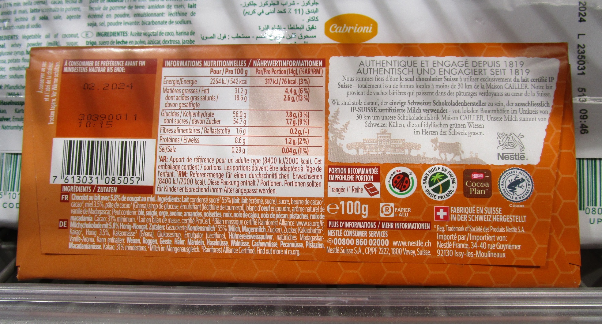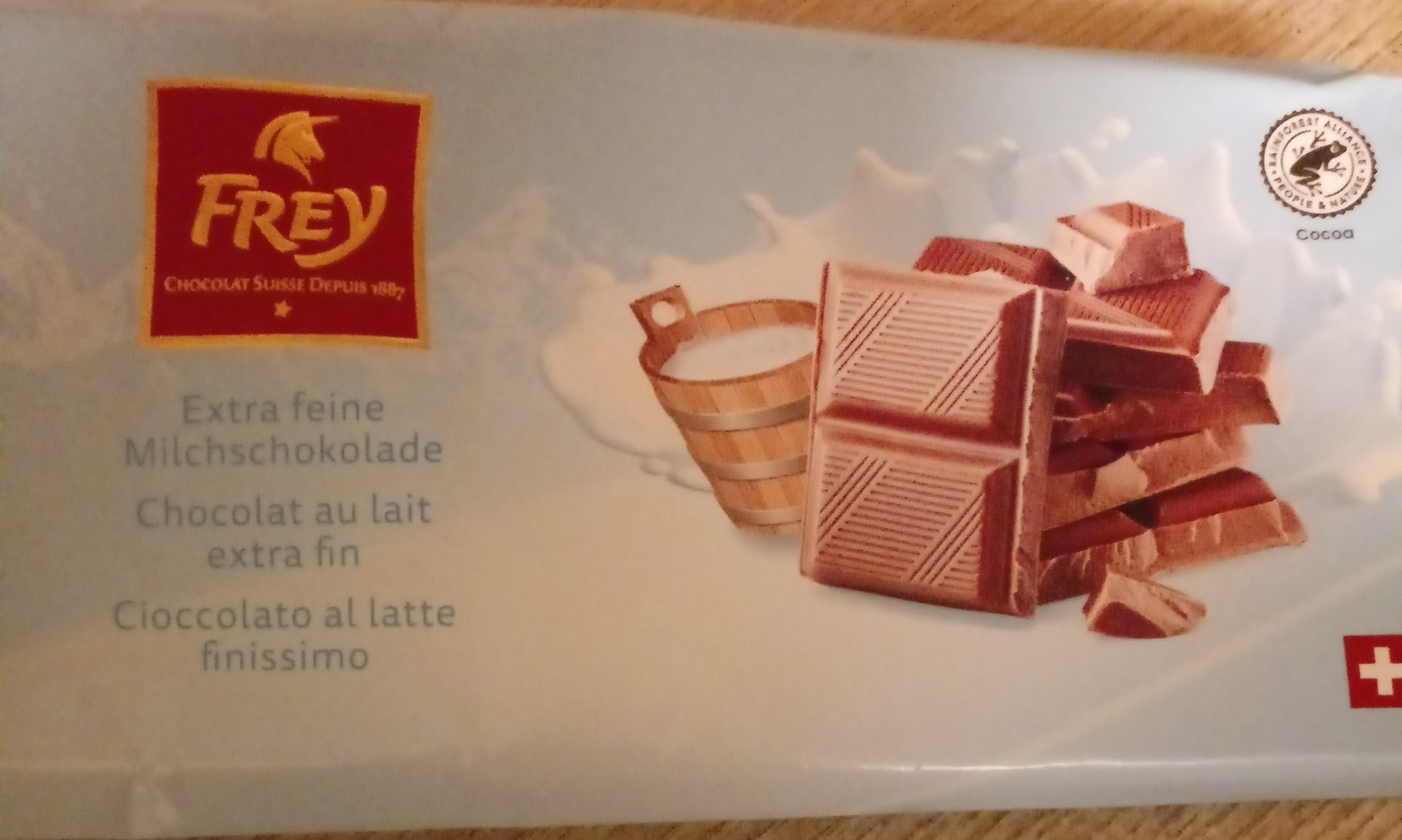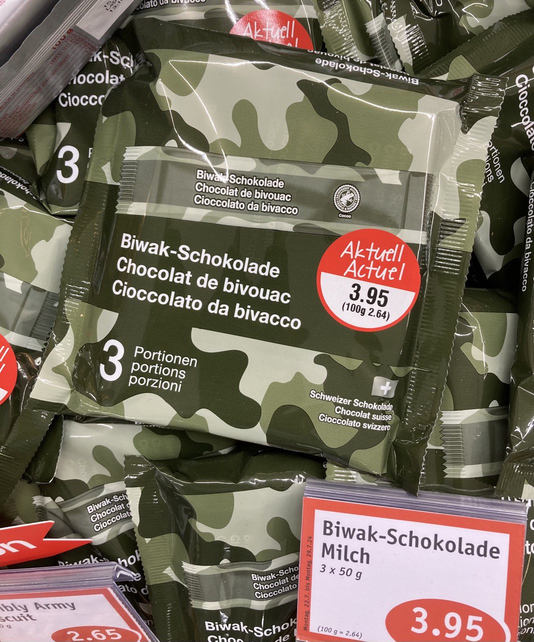 Schweiz am 29.8.2024: hat den Frosch von Bill Gates nun auch an der Biwak-Schokolade: Migros Eistee und Militärschokolade jetzt auch mit Frosch [57]