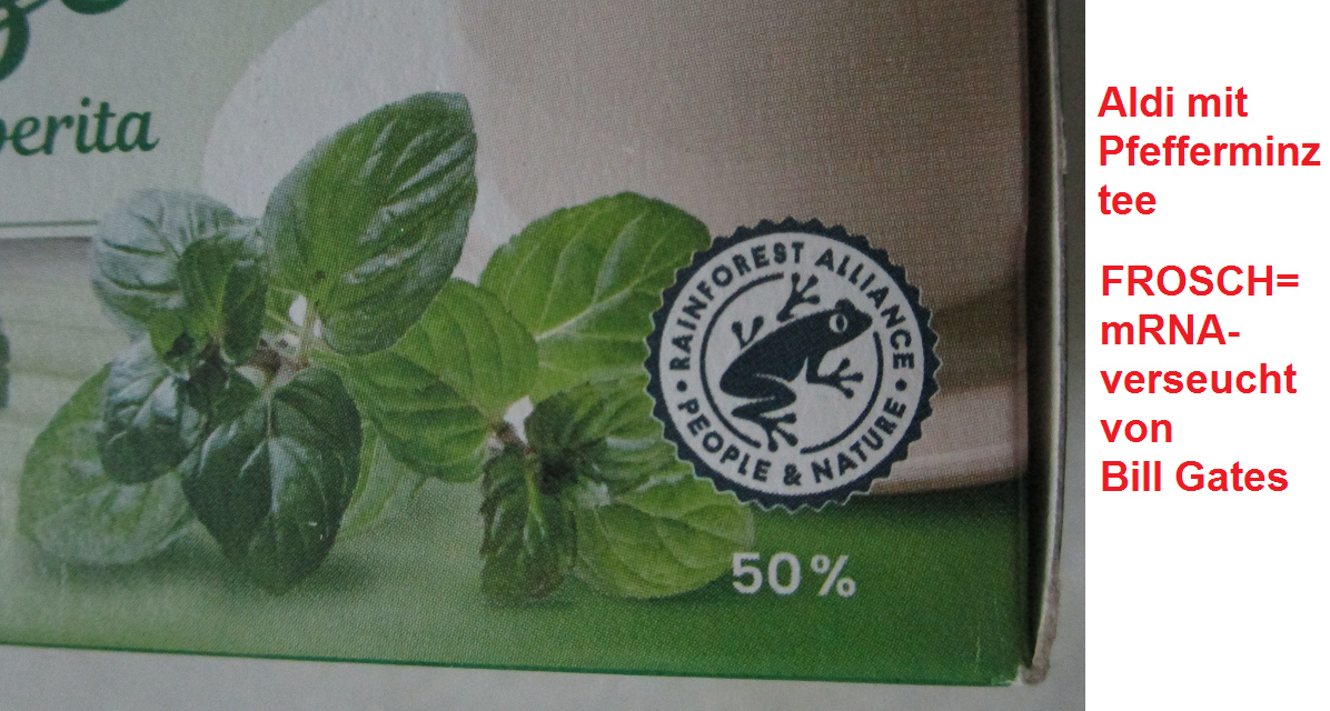4R 5.7.2023: Der mRNA-Frosch ist auf dem Tee von Aldi drauf: Pfefferminzentee mit Frosch Zoom [7]