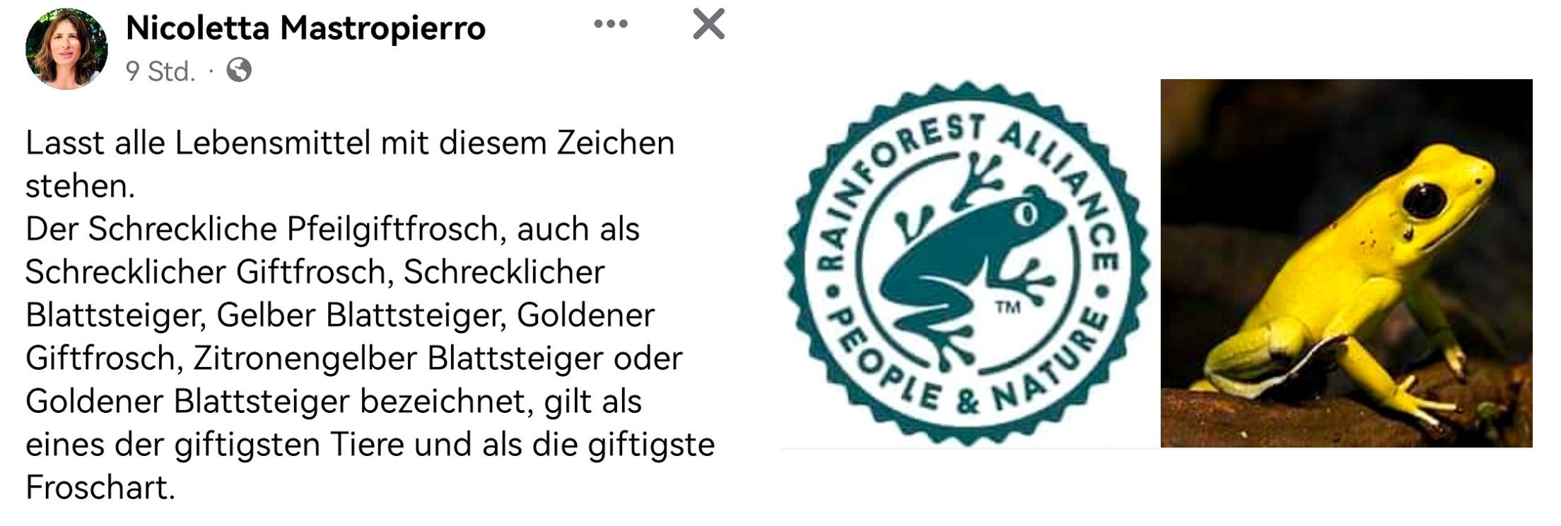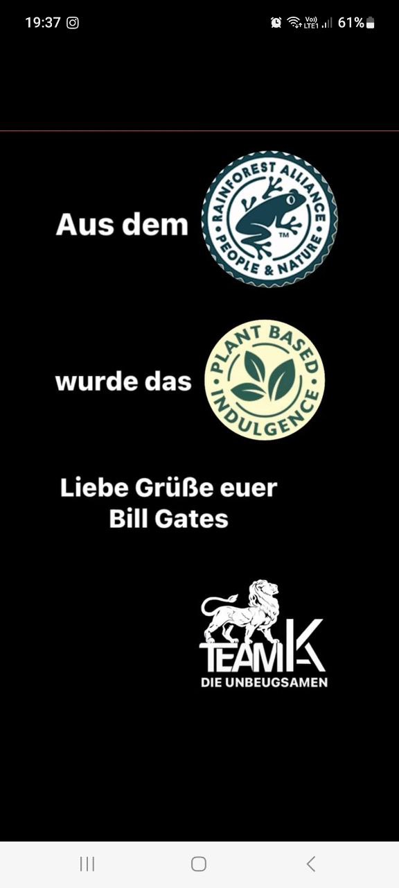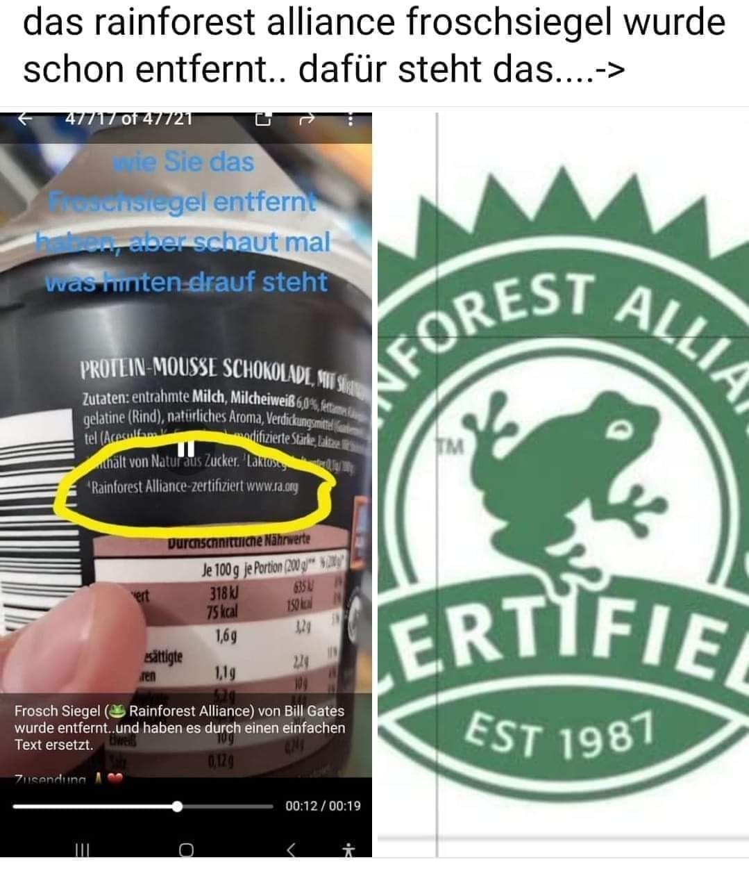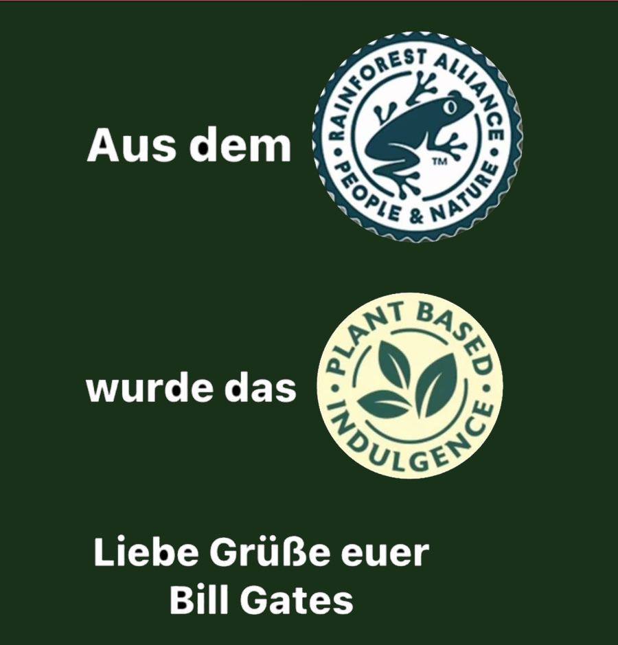 Gestern habe ich das "Frosch" Logo von Rainforest Alliance in einem Post gesetzt, der vor mRNA manipulierten Lebensmitteln warnt und daher möchte ich heute das Thema etwas weiter ausführen, denn hinter der eigentlich sinnvollen und ehrenhaften Intention, stecken die Eliten, wie Billy Boy oder Nestle u.v.m., weswegen dieses löbliche Vorhaben eher einem trojanischen Pferd gleicht, was auch die Tatsache zeigt, dass trotz der immensen Geldsummen die bereits von Billy Boy eingezahlt wurden, immer noch alle 5 Sekunden ein Regenwaldfläche von der Größe eines Fußballfedes geschlagen wird. Eine eigentlich wichtige Initiative für Erde und Mensch, wird wieder einmal von diabolischen Kräften beherrscht, die das Geld haben, was sie den Menschen aus der Tasche ziehen, um ihre niederen Interessen durchzusetzen! - Höchste Zeit für einen grundlegenden Wechsel! - ...