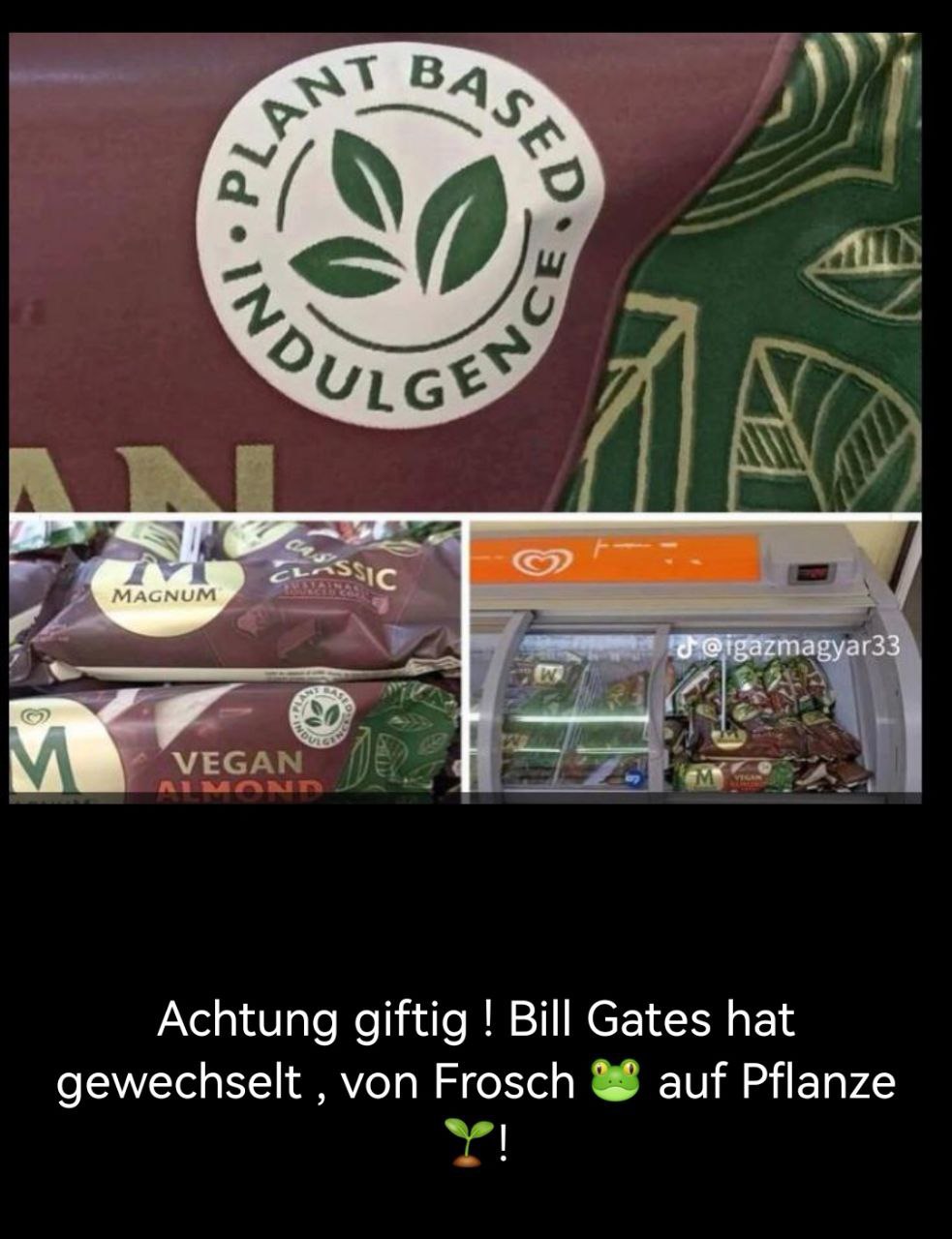 Impfmonster Bill Gates am 27.5.2024: macht aus dem Frosch ein Dreiblatt mit der Behauptung "Plant Based Indulgence" [55]