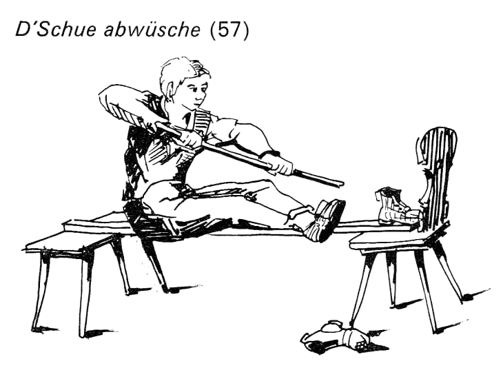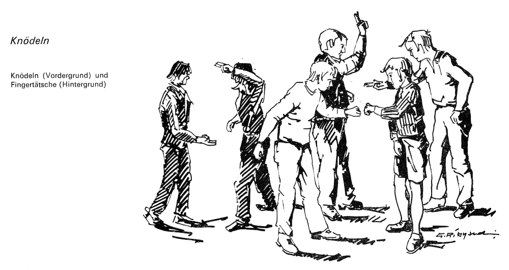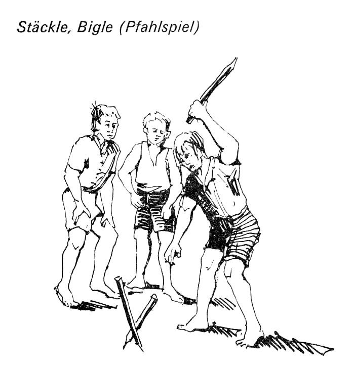 aus: Alte Kinderspiele [in der Schweiz]. Eine Sammlung volkskundlicher Bewegungsspiele; von Walter Seiler, mit Zeichnungen von Gustav Ritschard; dargestellt anlässlich der 700-Jahrfeier Unterseens im Jahre 1979. Sonderdruck der Schweizerischen Lehrerzeitung, Ausgabe "Schulpraxis", Monatsschrift des Bernischen Lehrervereins BLV, Nr. 25, 21. Juni 1979. Druck: Eicher + Co., 3001 Bern