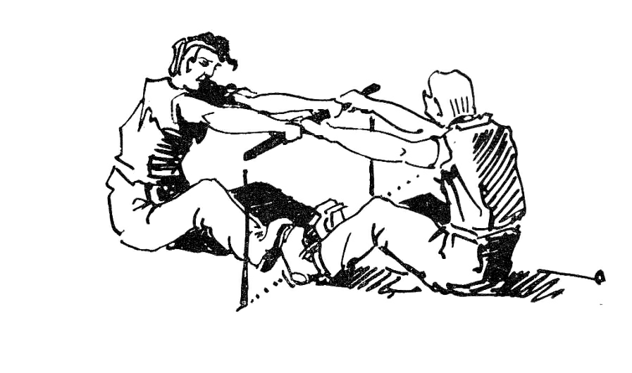 [Zwei Leute sitzen mit den Füssen gegeneinander und haben einen Stecken in der Hand, den sie sich gegenseitig aus den Händen reissen sollen].