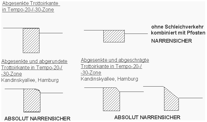 -- abgesenkte und abgerundete Trottoirkante in Tempo-20-/-30-Zone (z.B. Kandinskyallee, Hamburg), ist sehr flexibel, aber nur kombiniert mit Pfosten NARRENSICHER