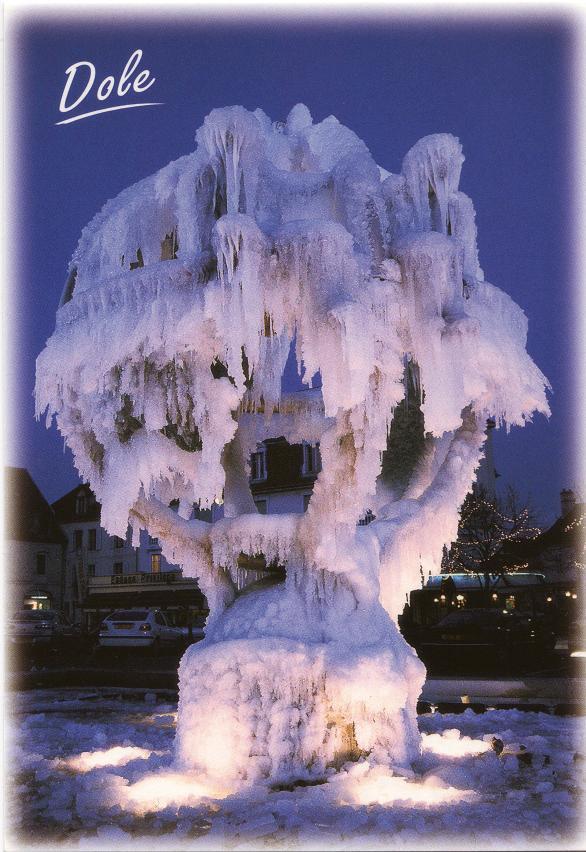 Der Text übersetzt: "Bilder vom Jura... 39100 Dole, Hauptstadt er einstigen Grafschaft, Geburtsstadt von Pasteur; Brunnenskulptur (Bronze-Edelstahl): "Der Doubs und die vier Sphären"; Abendbild im Winter; Entwurf und Realisation von Pierre Duc, um das neue Jahrtausend zu verdeutlichen."