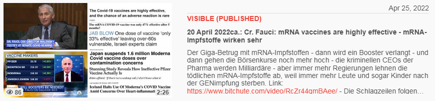 Video vom 25.4.2022: 20 April 2022ca.: Cr. Fauci: mRNA vaccines are highly effective - mRNA-Impfstoffe wirken sehr
