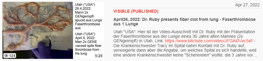 Video vom 27.4.2022: April26, 2022: Dr. Ruby presents fiber clot from lung - Faserthrombose aus 1 Lunge