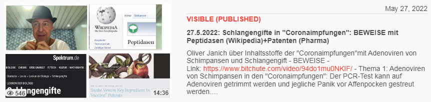 Video vom 27.5.2022: 27.5.2022: Schlangengifte in "Coronaimpfungen": BEWEISE mit Peptidasen (Wikipedia)+Patenten (Pharma)