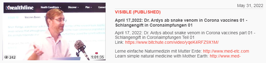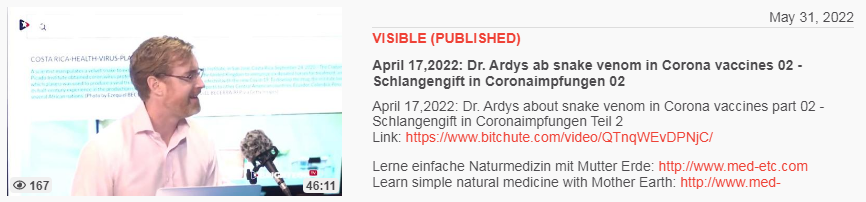 Video vom 31.5.2022: April 27,2022: Dr. Ardys ab snake venom in Corona vaccines 01 - Schlangengift in Coronaimpfungen 01