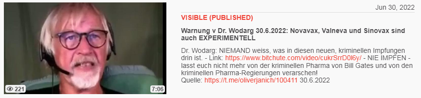 Video vom 30.6.2022: Warnung v Dr. Wodarg 30.6.2022: Novavax, Valneva und Sinovax sind auch EXPERIMENTELL