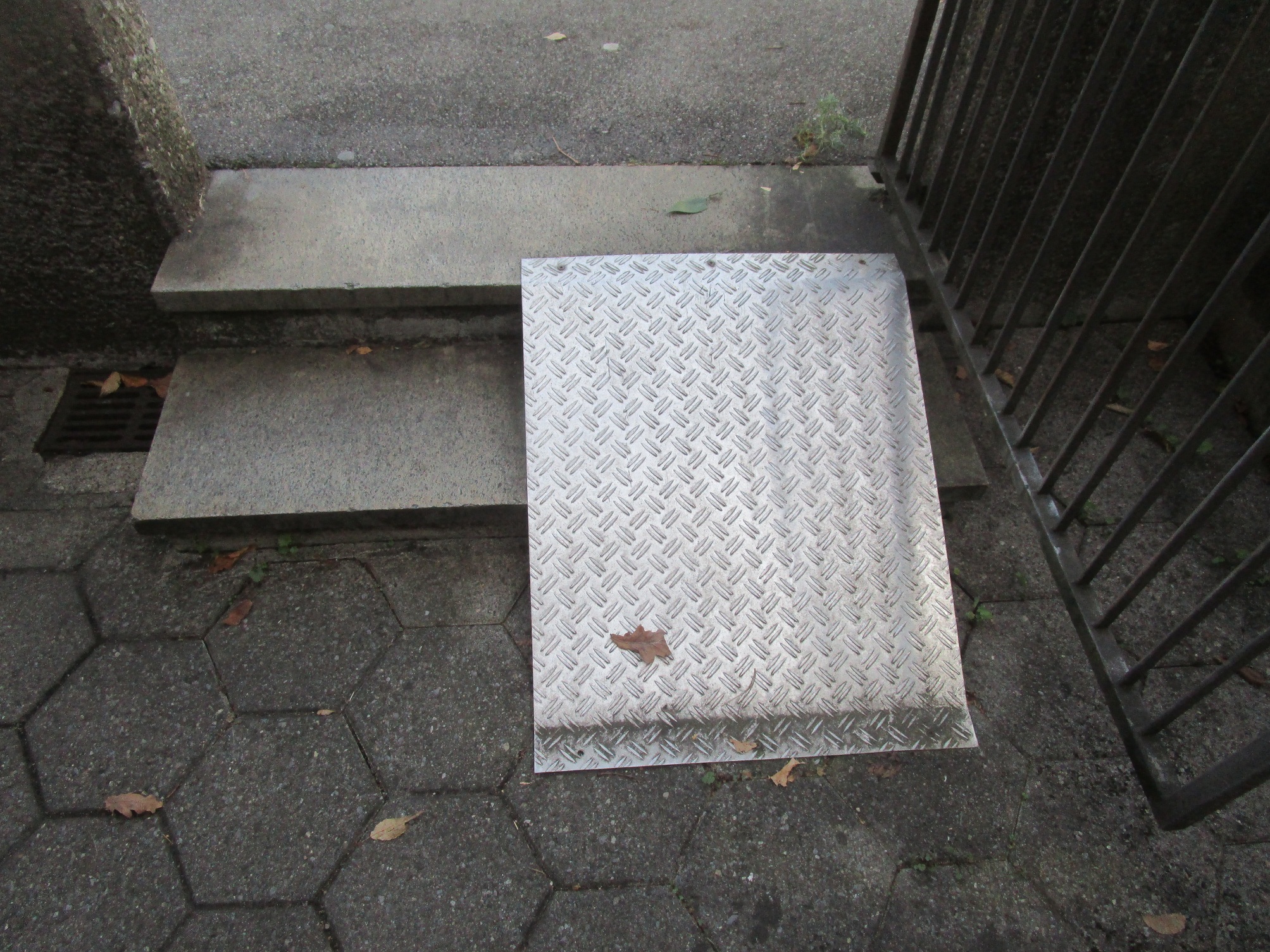 -- Rollstuhlrampen rahmen die Treppe ein, Riffelbelag