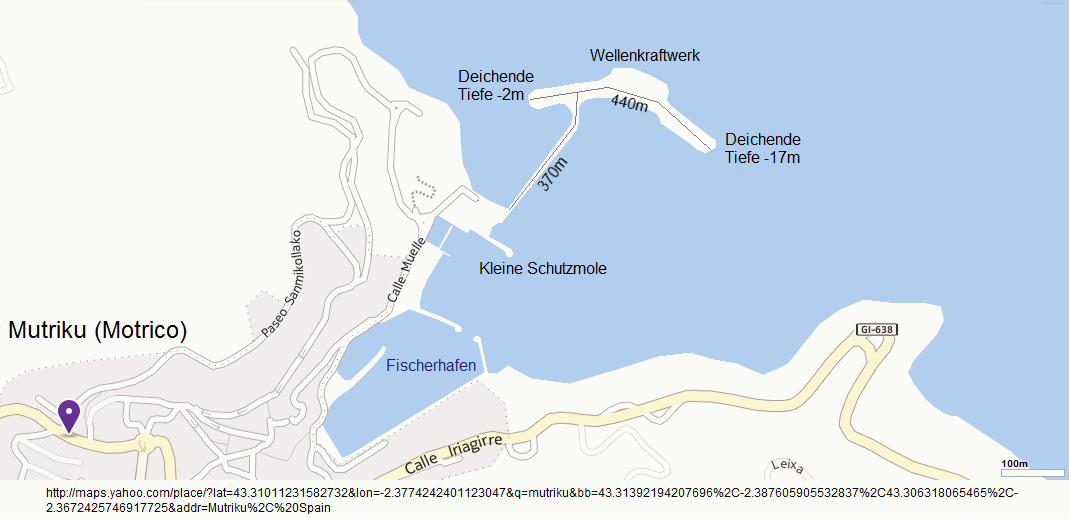 [20] Karte von Mutriku (Motrico) mit dem Fischerhafen und dem grossen Schutzdeich mit dem Wellenkraftwerk mit den Abmessungen: yahoo maps