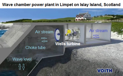Wave chamber power plant in Limpet on Islay Island in southern Scotland, built in 2000, schematic from video [4]