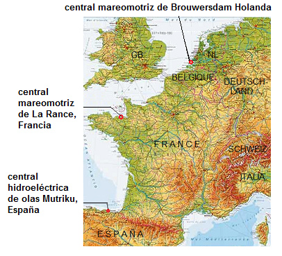Mapa que muestra la posición de las centrales mareomotrices Brouwersdam con el mar de Grevelingen en Holanda y "La Rance" cerca de Saint-Malo en Bretaña en Francia [2].